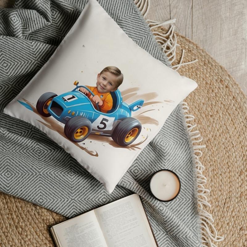 Personalizowana poduszka WYŚCIG z grafiką bajkową i zdjęciem dziecka w wyścigówie. Idealny prezent dla małego miłośnika przygód.