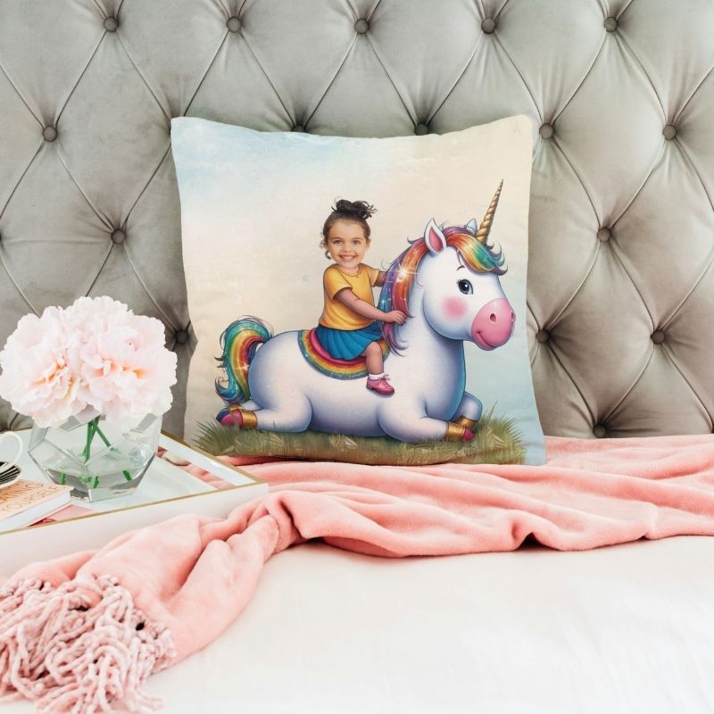 personalizowana poduszka jednorożec - personalizowana poduszka z uśmiechniętym dzieckiem siedzącym na bajkowym jednorożcu z tęczową grzywą na tle pastelowego nieba