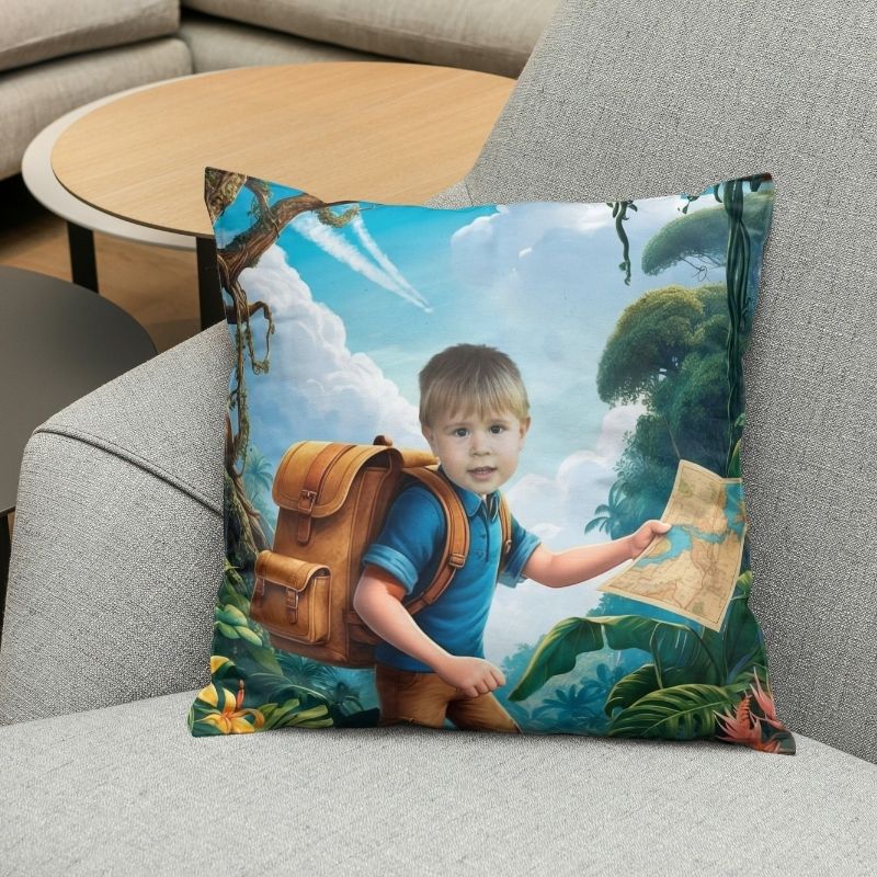 Poduszka ze zdjęciem podróżnik skarb – dziecko jako mały odkrywca z mapą i skarbem w dżungli
