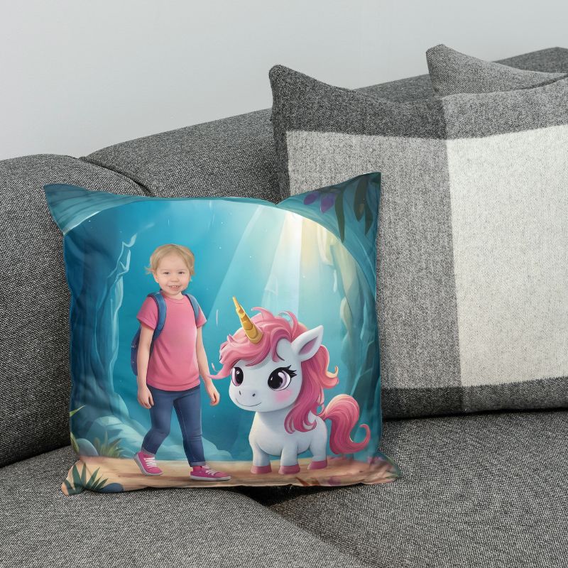 Poduszka ze zdjęciem dziecka na jednorożcu - idealny prezent dla każdego fana jednorożców. Idealna na prezent na każdą okazję.