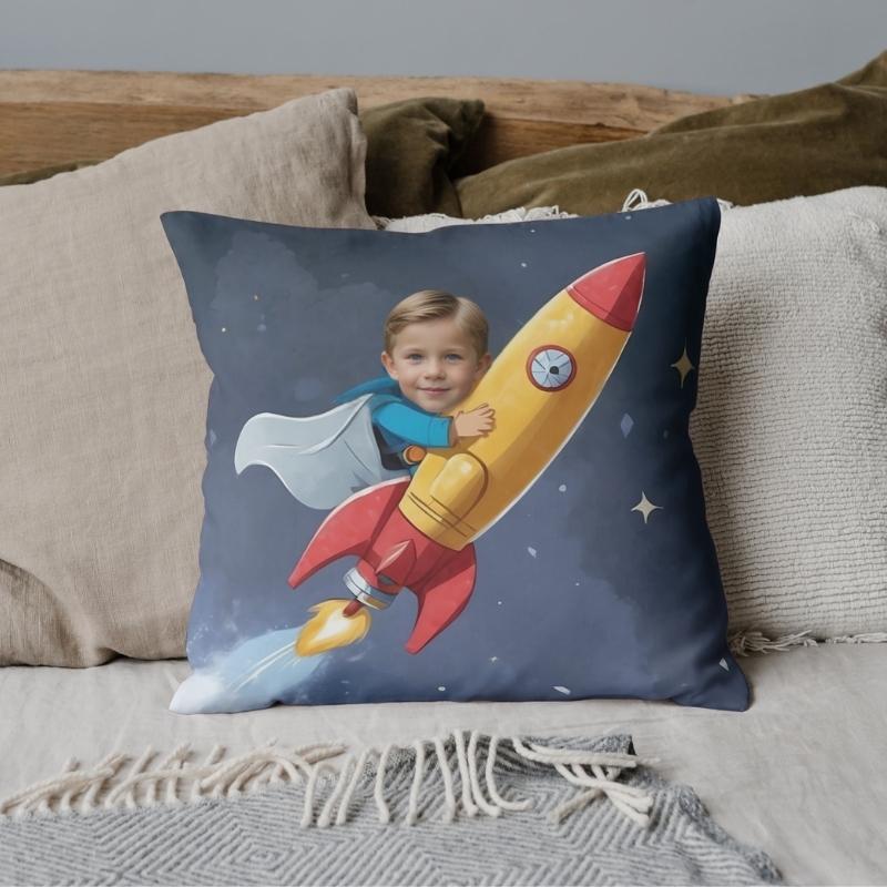 poduszka ze zdjęciem rakieta Poduszka personalizowana z dzieckiem lecącym rakietą w kosmosie