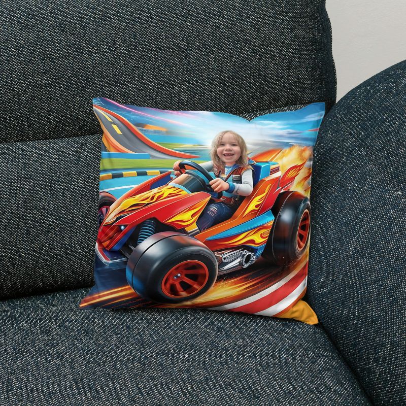 Personalizowana poduszka WYŚCIG z grafiką bajkową i zdjęciem dziecka w wyścigówie. Idealny prezent dla małego miłośnika przygód.