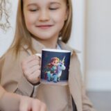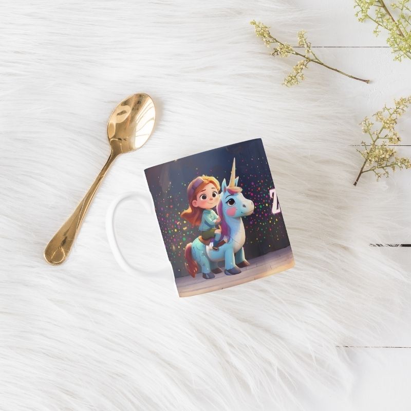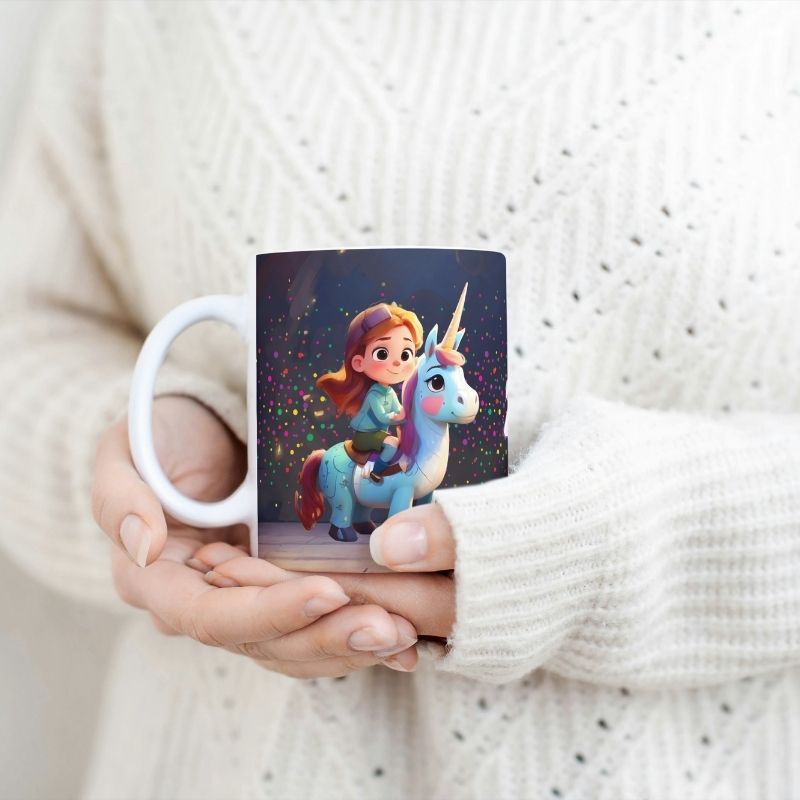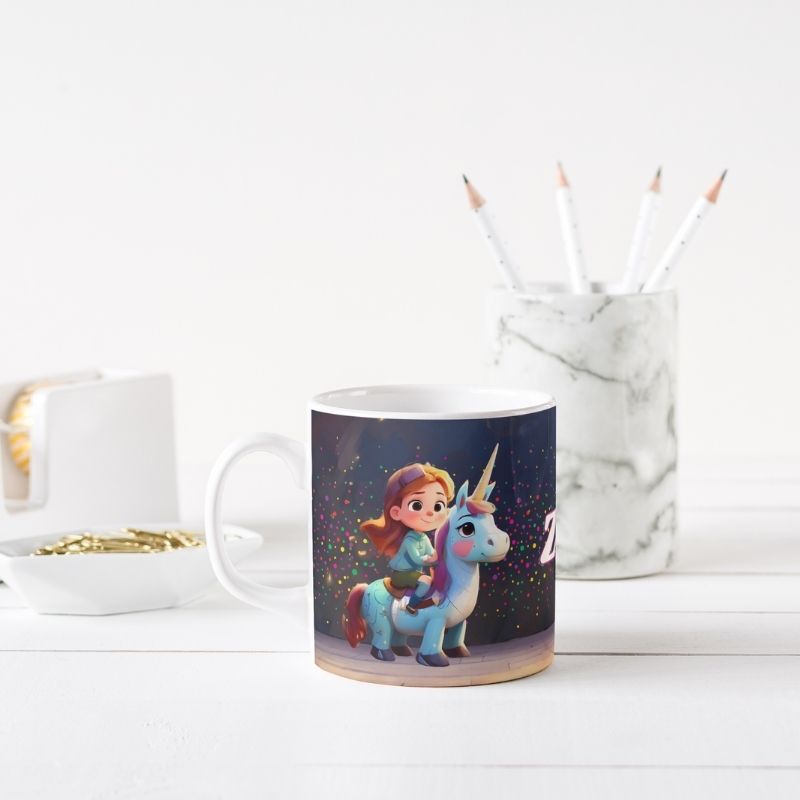Grafika na kubku przedstawia dziecko na grzbiecie jednorożca. A co jest najlepsze? Ta odważna bohaterka może mieć imię Twojego dziecka! Wyobraź sobie radość na jej twarzy, gdy zobaczy swój podpisany kubek z uroczym jednorożcem, gotowa na magiczną przygodę! Kubek jest podpisany imieniem właściciela, co czyni go jeszcze bardziej wyjątkowym.. To idealny sposób, aby pobudzić wyobraźnię i marzenia o dalekich podróżach.