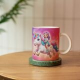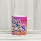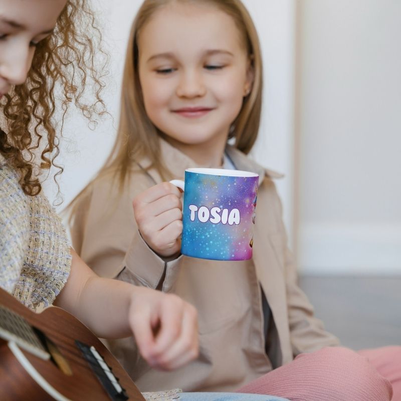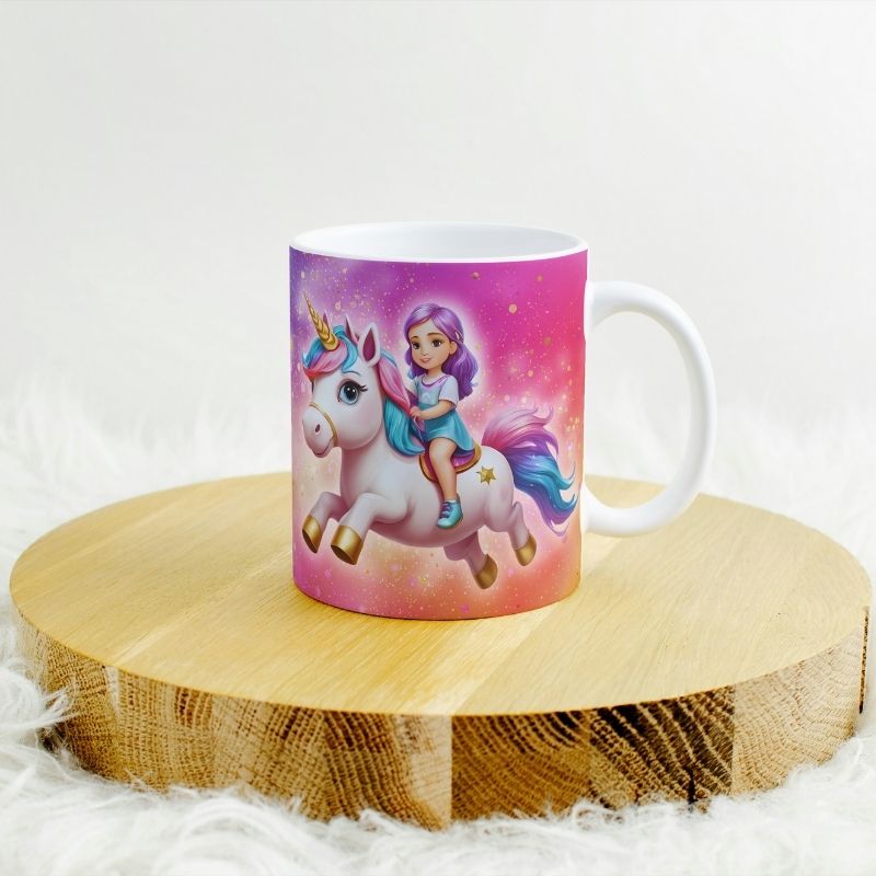 Grafika na kubku przedstawia dziecko na grzbiecie jednorożca. A co jest najlepsze? Ta odważna bohaterka może mieć imię Twojego dziecka! Wyobraź sobie radość na jej twarzy, gdy zobaczy swój podpisany kubek z uroczym jednorożcem, gotowa na magiczną przygodę! Kubek jest podpisany imieniem właściciela, co czyni go jeszcze bardziej wyjątkowym.. To idealny sposób, aby pobudzić wyobraźnię i marzenia o dalekich podróżach.