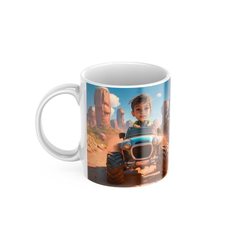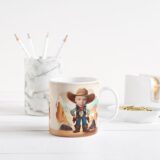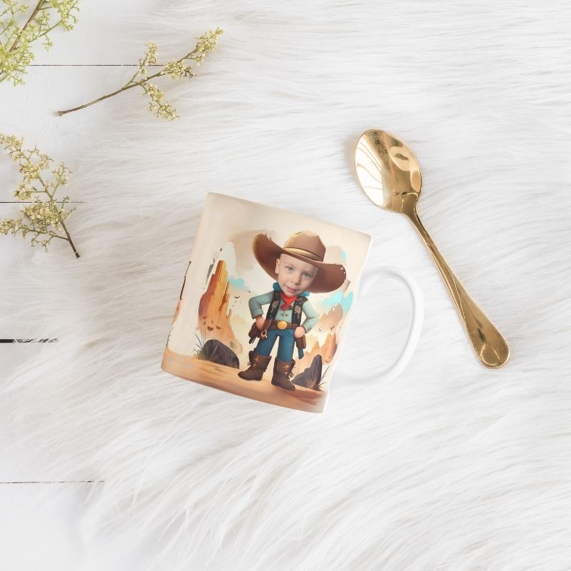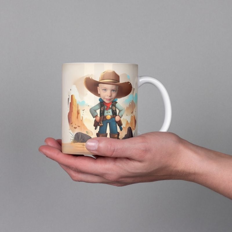 Grafika na kubku przedstawia dziecko jako Kowboja w stylowym, kowbojskim kapeluszu. A co jest najlepsze? Ten odważny bohater może mieć twarz Twojego dziecka! Wyobraź sobie radość na jego twarzy, gdy zobaczy siebie jako kowboja, gotowego na przygodę na dzikim zachodzie! Kubek nie tylko zawiera Twoje zdjęcie, ale jest również podpisany imieniem właściciela, co czyni go jeszcze bardziej wyjątkowym.. To idealny sposób, aby pobudzić wyobraźnię i marzenia o dalekich podróżach.