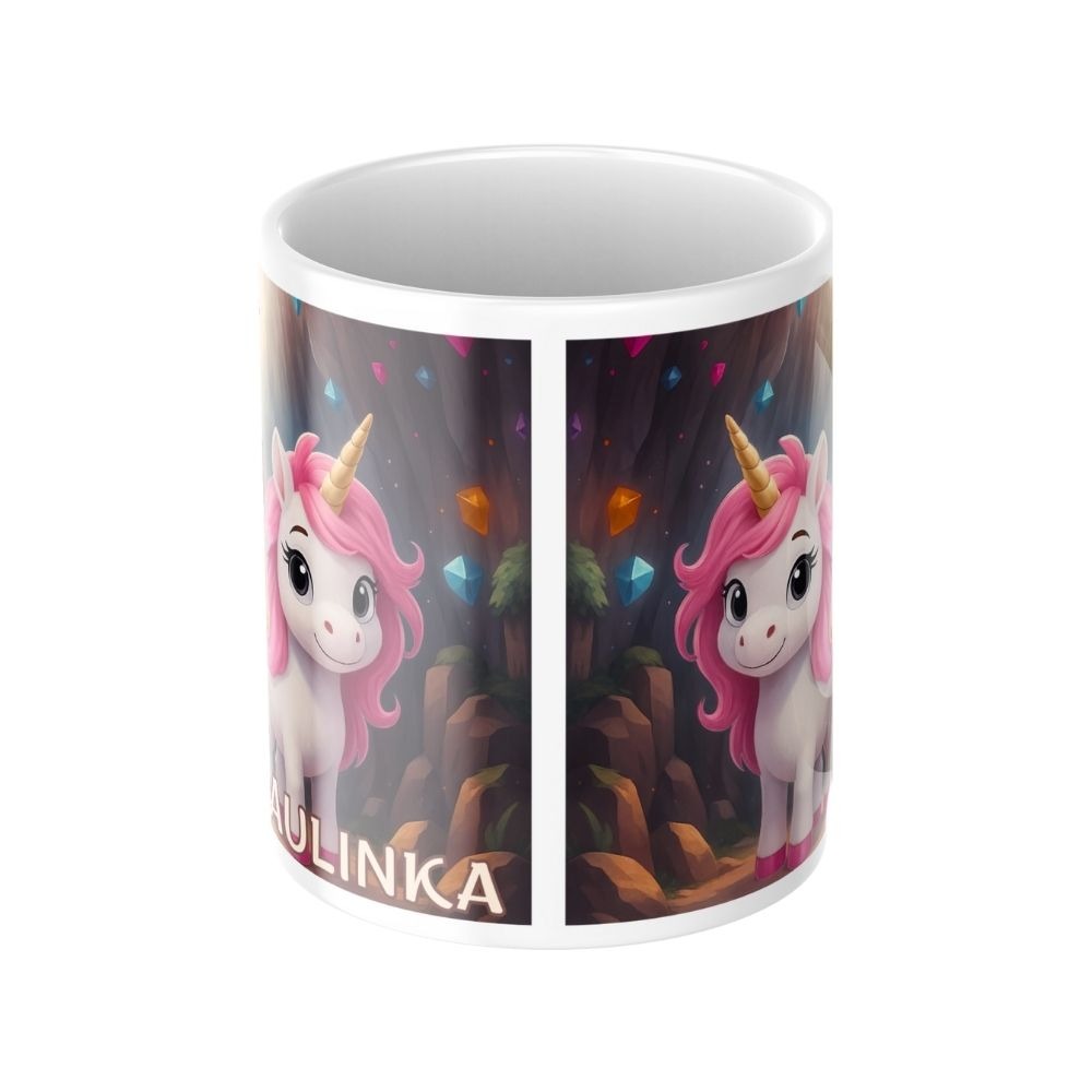 Odkryj personalizowany kubek z jednorożcem i zdjęciem dziecka. Urocza scena w jaskini, pastelowe kolory, możliwość dodania imienia i ekspresowa wysyłka 24 h po akceptacji projektu. Idealny prezent dla dziewczynki kochającej bajkowe motywy.