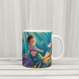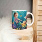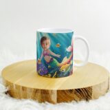 Grafika na kubku przedstawia dziecko jako Syrenkę pływającą w morskich głębinach. A co jest najlepsze? Ta odważna bohaterka może mieć twarz Twojego dziecka! Wyobraź sobie radość na jej twarzy, gdy zobaczy siebie jako syrenkę, gotową na podwodną przygodę! Kubek nie tylko zawiera Twoje zdjęcie, ale jest również podpisany imieniem właściciela, co czyni go jeszcze bardziej wyjątkowym.. To idealny sposób, aby pobudzić wyobraźnię i marzenia o dalekich podróżach.