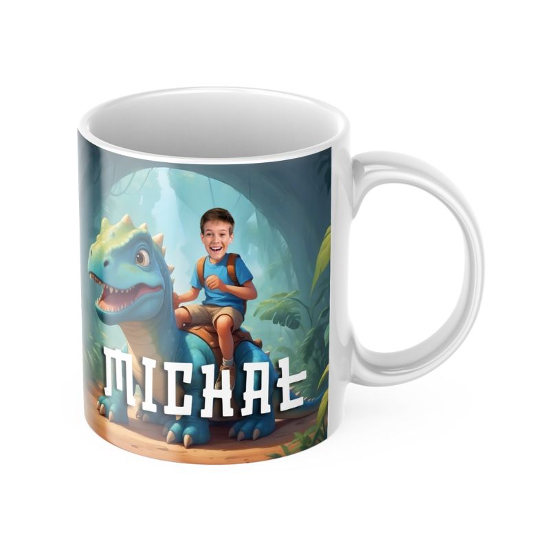 Największą atrakcją naszego kubka jest możliwość personalizacji! Na grafice przedstawiającej dziecko siedzące na grzbiecie dinozaura, możemy umieścić twarz Twojego dziecka. Wystarczy, że prześlesz nam zdjęcie, a my zajmiemy się resztą. To nie wszystko! Możesz również dodać własny napis, na przykład imię dziecka. Wystarczy, że wpiszesz je w uwagach na końcowym etapie składania zamówienia.