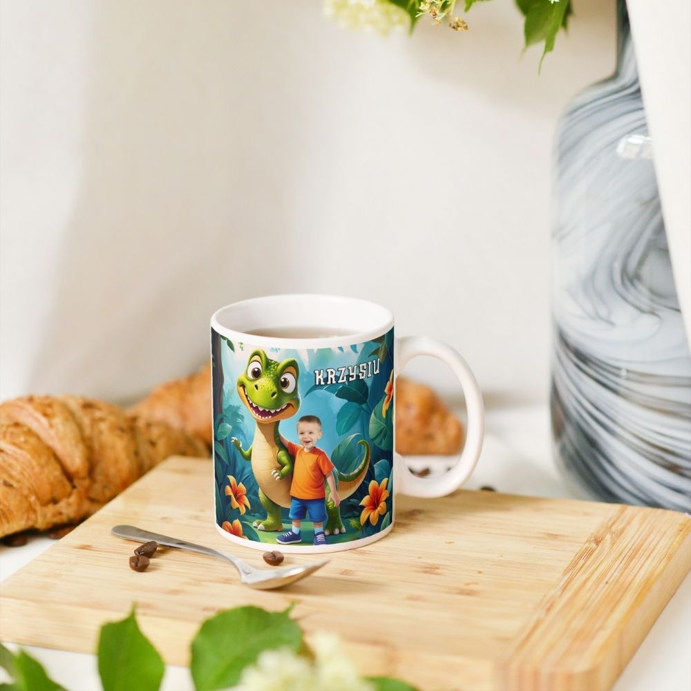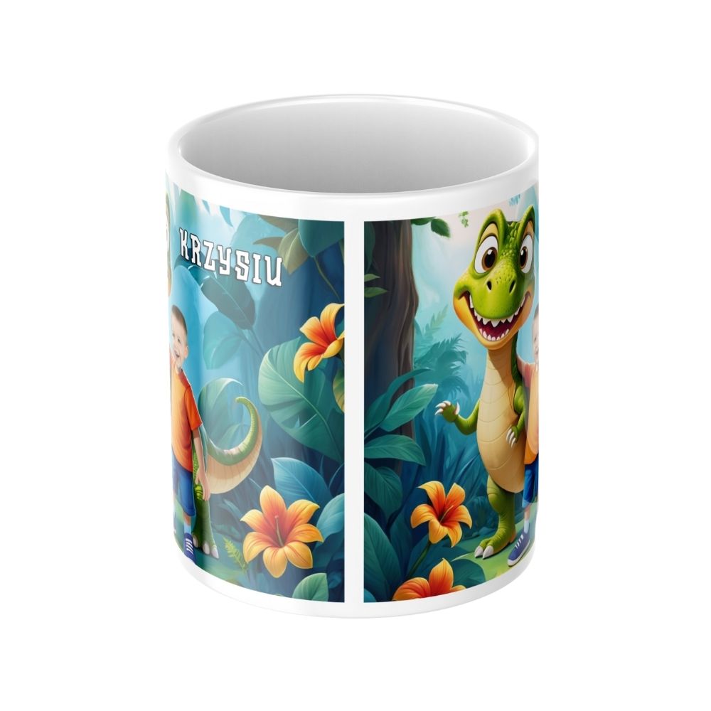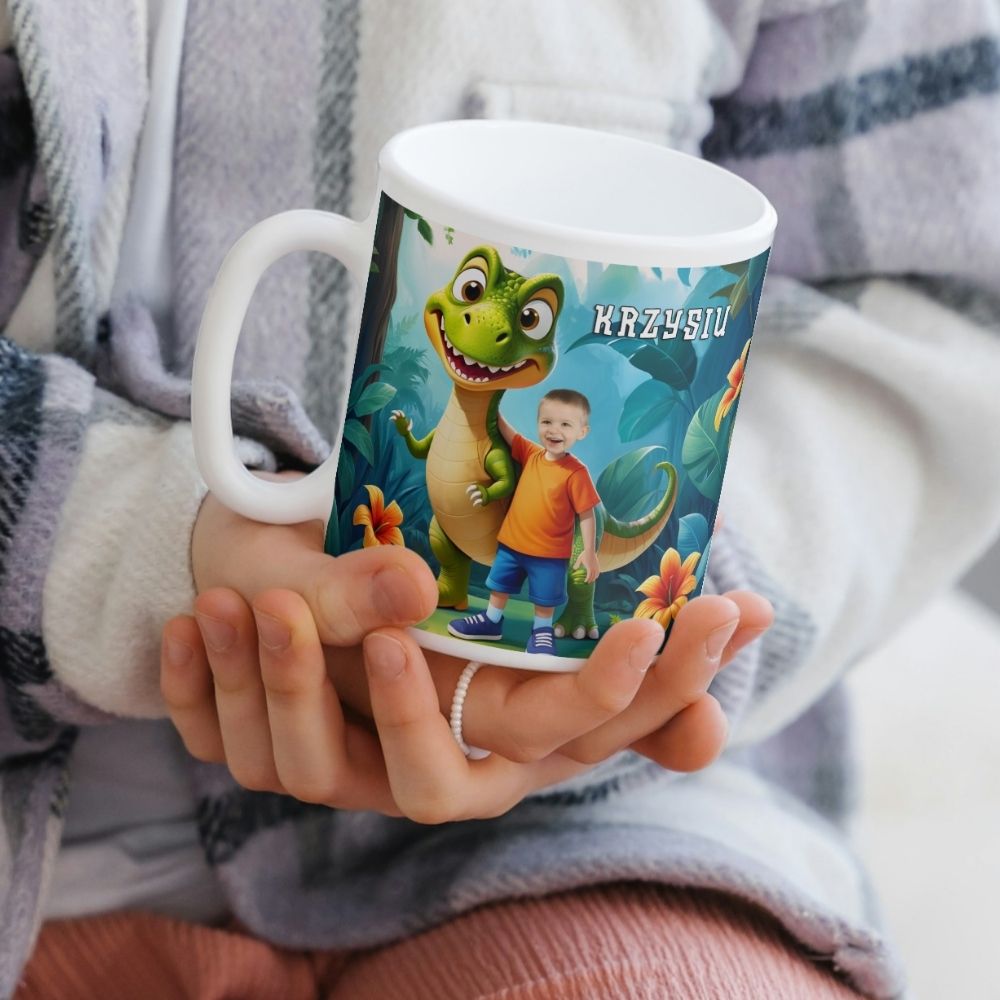 Kolorowa grafika przedstawia uśmiechniętego Dinusia stojącego w tropikalnej dżungli pełnej roślinności i kwiatów. Obok niego znajduje się dziecko – zdjęcie zostało ręcznie dopasowane do ilustracji, tworząc efekt naturalnej bajkowej sceny. To nie jest zwykły kubek, lecz produkt, który wzbudza emocje, a personalizowany kubek dinuś ze zdjęciem z powodzeniem staje się ulubionym przedmiotem małych odkrywców. Dzieci uwielbiają motywy dinozaurów, dlatego kubek z dinusiem i zdjęciem to doskonały wybór dla każdego malucha, który marzy o własnych przygodach w świecie prehistorycznych stworzeń.