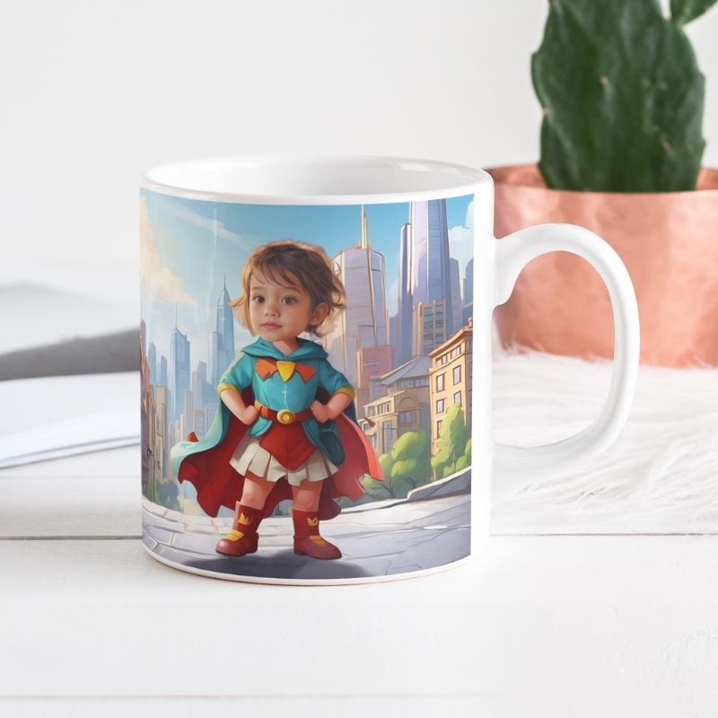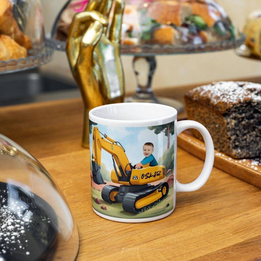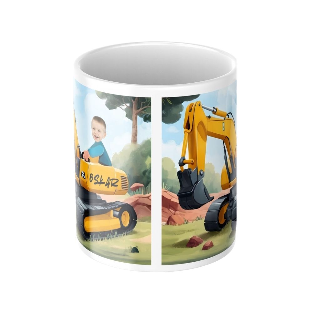 Personalizowany kubek koparka ze zdjęciem dziecka i opcjonalnym imieniem. Bajkowa ilustracja, intensywne kolory i pełna personalizacja. Projekt w 24h, szybka wysyłka. Idealny prezent dla malucha kochającego koparki i maszyny budowlane.