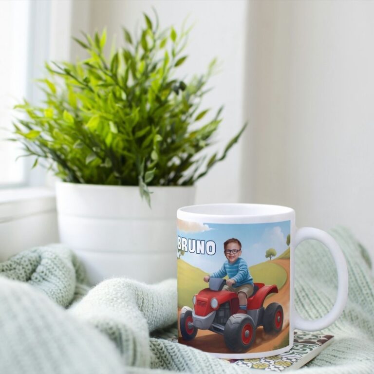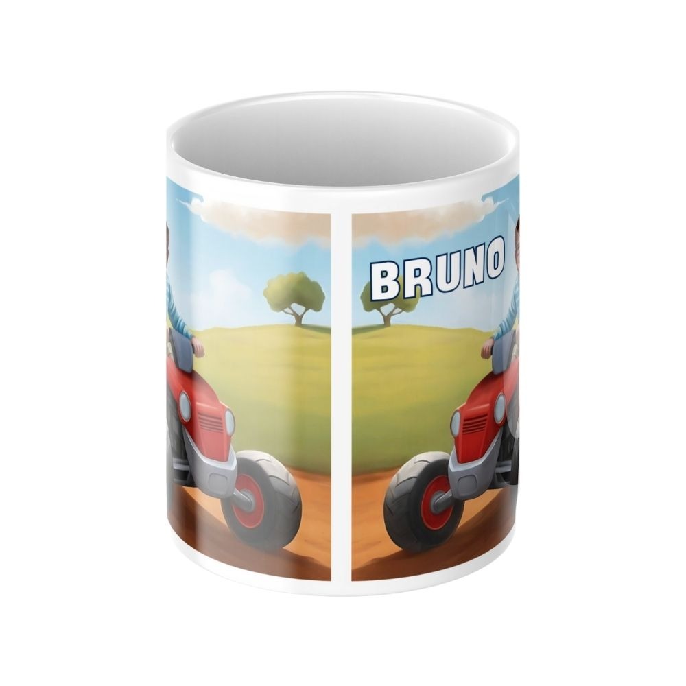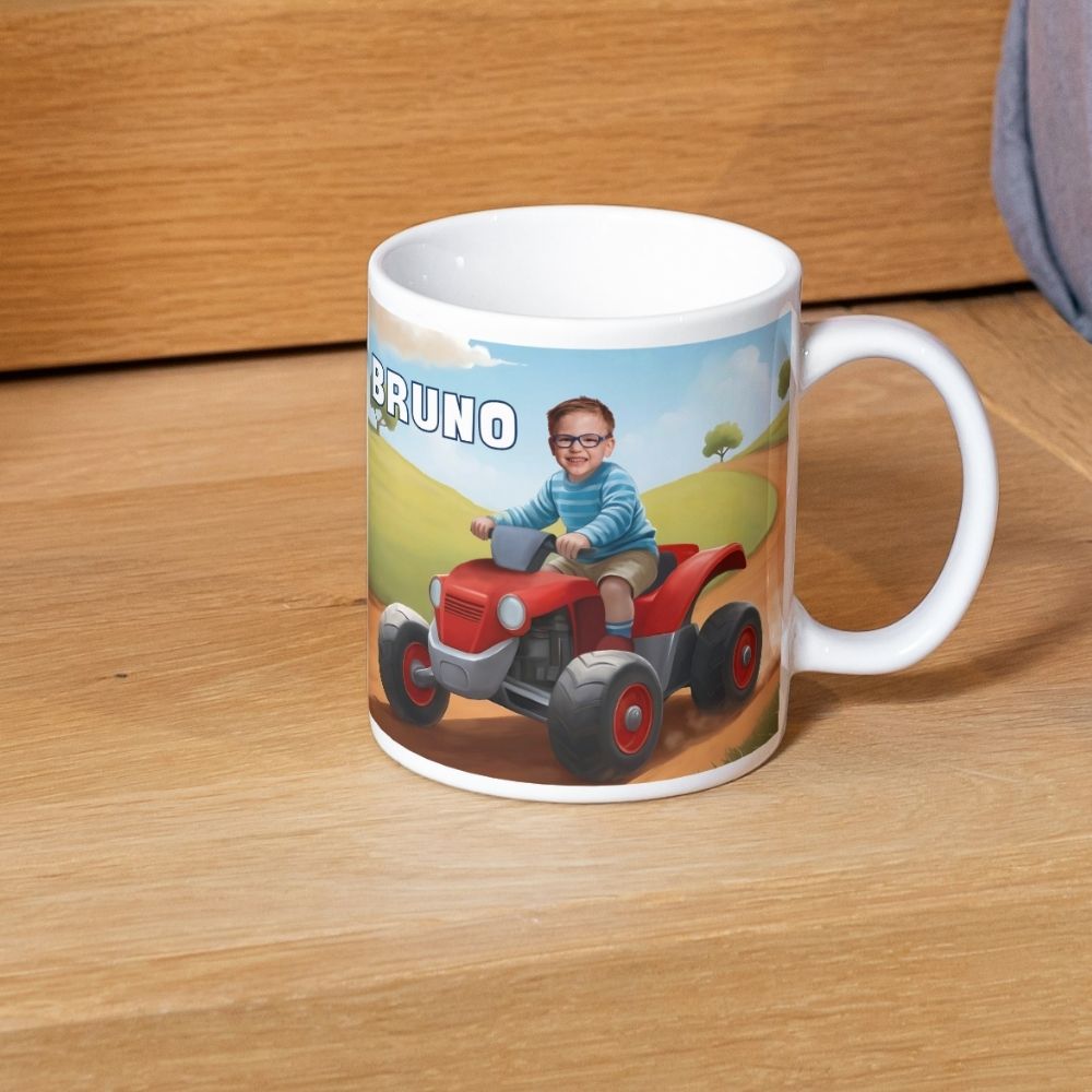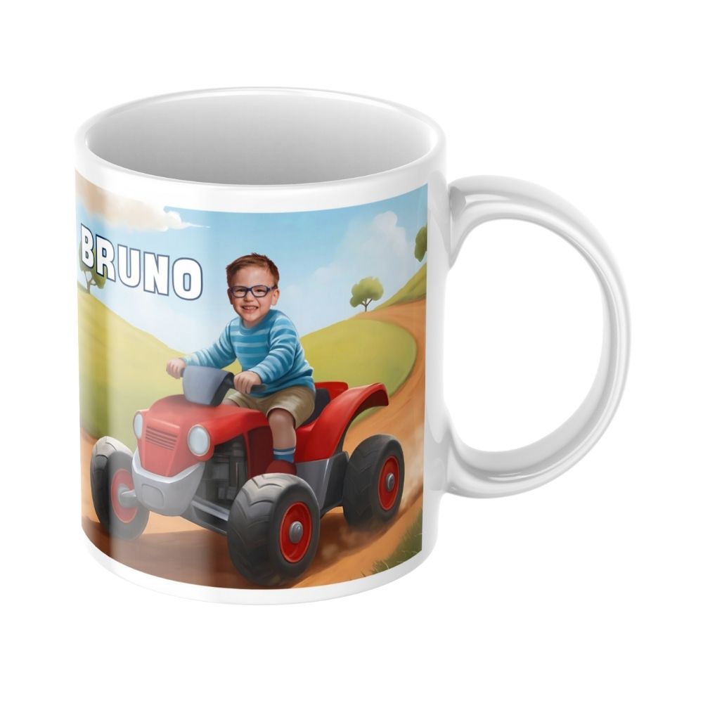 Personalizowany kubek quad ze zdjęciem dziecka i opcjonalnym imieniem. Kolorowa, bajkowa grafika z quadem, projekt SMS w 24 godziny i ekspresowa wysyłka. Idealny prezent dla chłopca, który kocha pojazdy i terenowe przygody.