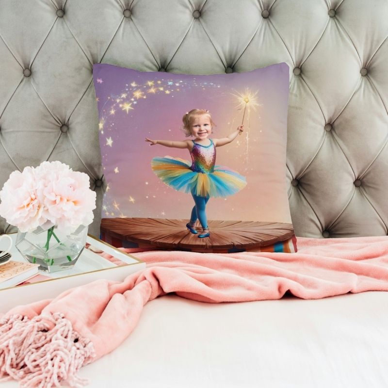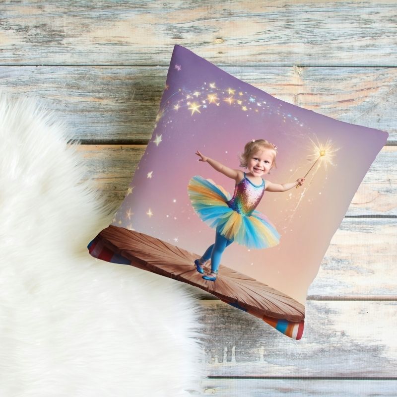 Poduszka akrobatka ze zdjęciem dziecka – dziewczynka w bajkowym stroju na scenie z różdżką