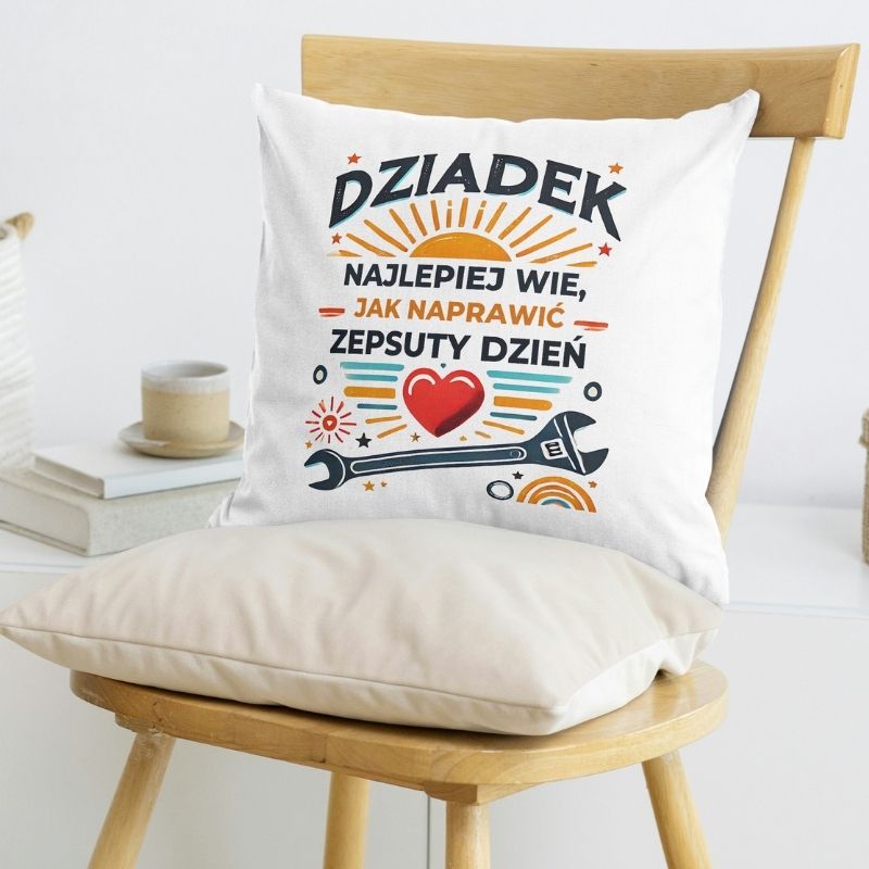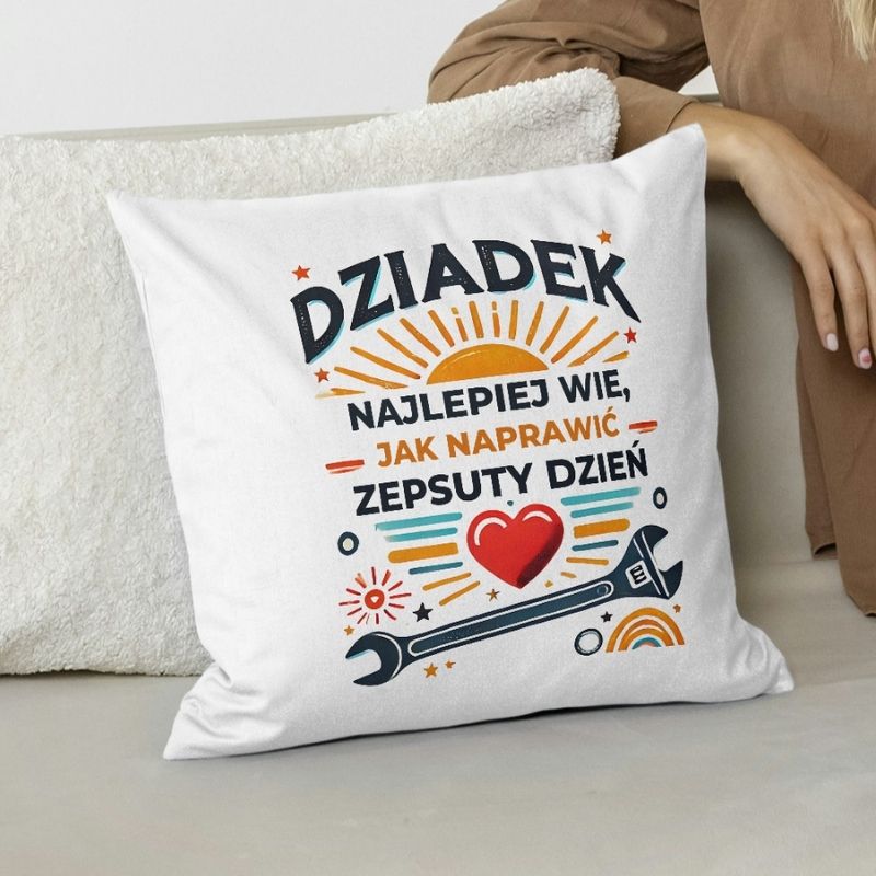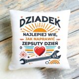 Poduszka dla dziadka z napisem – „Dziadek najlepiej wie, jak naprawić zepsuty dzień”