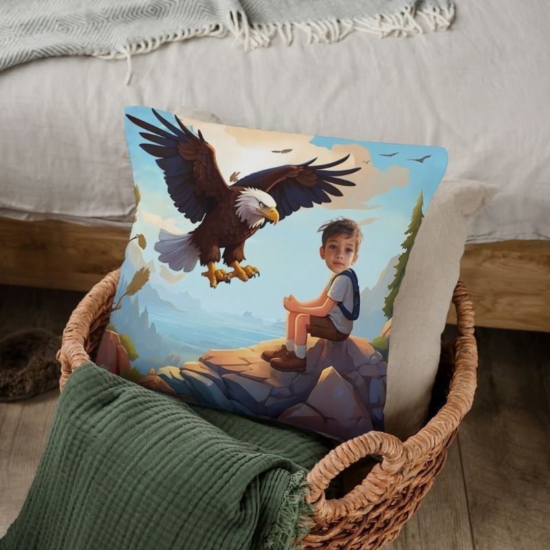 To nie zwykła poduszka z nadrukiem – to personalizowany prezent, na którym Twoje dziecko staje się odważnym odkrywcą górskich szczytów. Wyobraź sobie jego reakcję, gdy zobaczy siebie siedzącego na skalistym szczycie, a majestatyczny orzeł leci wprost do niego!