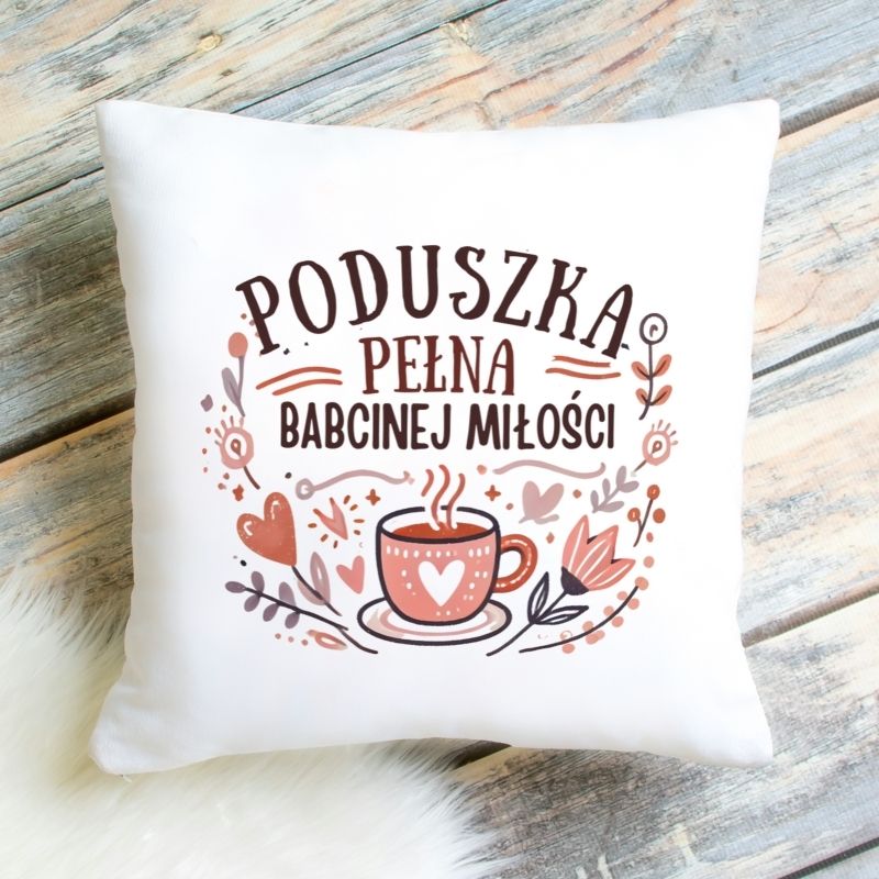 Poduszka pełna babcinej miłości to niezwykły sposób, aby wyrazić miłość i wdzięczność dla ukochanej Babci. Delikatny napis, urocze grafiki serc, kwiatów i filiżanki z gorącym napojem tworzą projekt, który oddaje ciepło rodzinnych wspomnień i wyjątkową atmosferę, jaką Babcia tworzy każdego dnia. To idealny prezent na Dzień Babci, urodziny, imieniny, a także każdą inną okazję, by powiedzieć „Dziękuję za Twoją miłość”.
