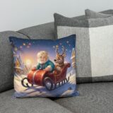 • Personalizacja, która zachwyca – zdjęcie dziecka zostaje wkomponowane w grafikę świątecznych sań, co czyni poduszkę unikalną.