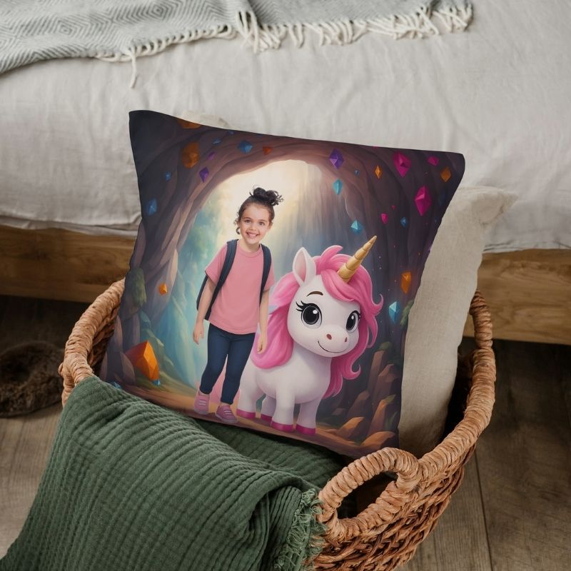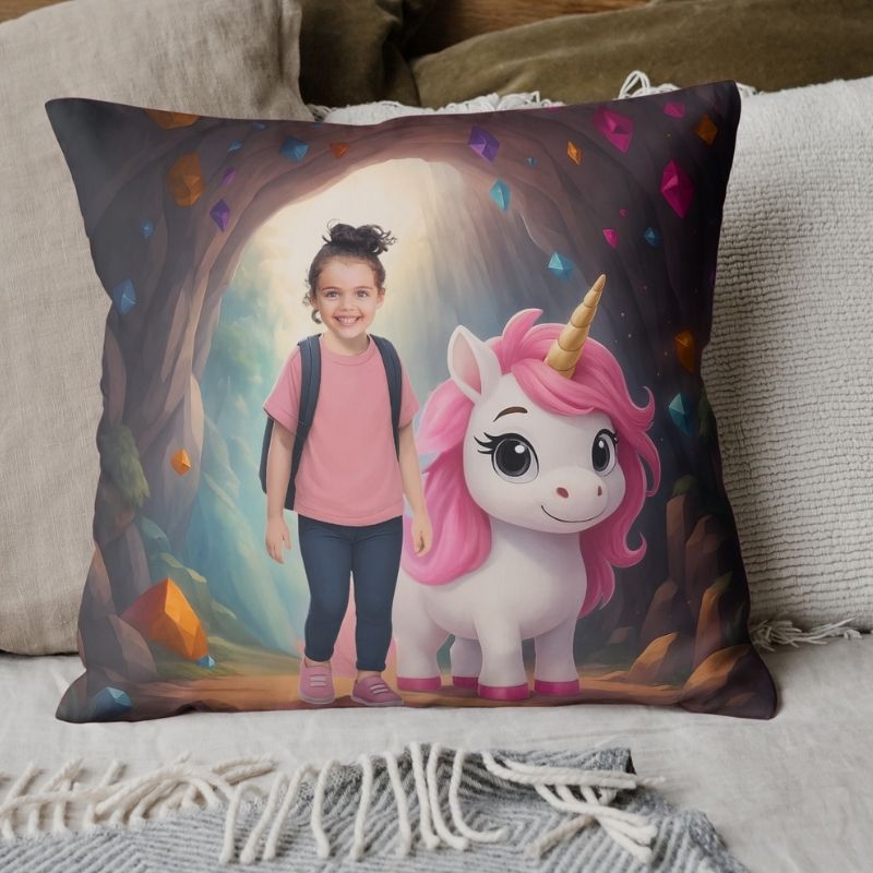 Poduszka z jednorożcem i zdjęciem w jaskini – idealny prezent na każdą okazję