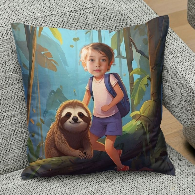 Personalizowana poduszka z leniwcem i zdjęciem dziecka w dżungli. poduszka ze zdjęciem leniwiec