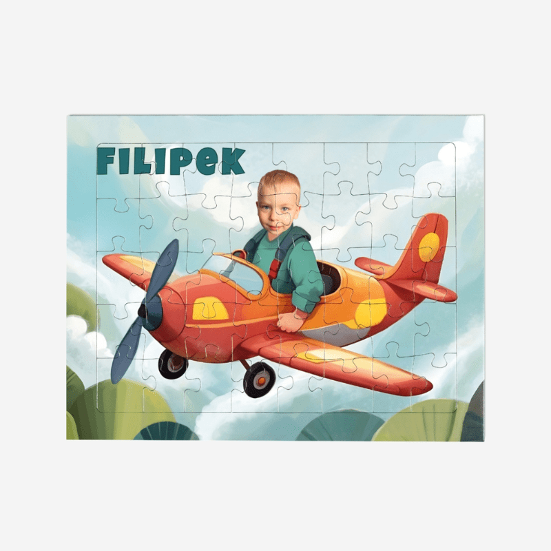 Personalizowane puzzle Samolot to wyjątkowa układanka dla dzieci, które marzą o podniebnych przygodach. Na bajkowym tle z chmurami Twoje dziecko zasiada za sterami kolorowego samolotu i wyrusza w swoją pierwszą wyprawę w przestworza! Puzzle tworzone są na podstawie przesłanego zdjęcia, dzięki czemu każdy zestaw jest jedyny w swoim rodzaju. Wykonane z ekologicznej płyty puzzlowej z certyfikatem FSC® i nadrukowane farbami wodnymi, są bezpieczne dla najmłodszych i trwałe w użytkowaniu. Personalizowane puzzle Samolot ze zdjęciem dziecka to nie tylko zabawa, ale też piękna pamiątka i idealny prezent dla małego pilota, który marzy o lataniu.