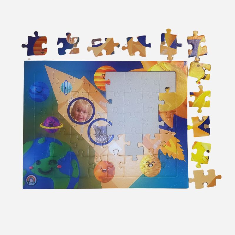 Personalizowane puzzle Kosmos to wyjątkowa układanka, która zabierze Twoje dziecko w podróż po Układzie Słonecznym. W bajkowej scenerii pełnej uśmiechniętych planet i gwiazd, maluch leci rakietą między Słońcem, Marsem, Saturnem i Neptunem – stając się prawdziwym odkrywcą kosmosu. Każdy zestaw powstaje na podstawie przesłanego zdjęcia dziecka, dzięki czemu jest jedyny w swoim rodzaju. Puzzle wykonane są z ekologicznej płyty puzzlowej z certyfikatem FSC® i nadrukowane bezpiecznymi farbami wodnymi. Personalizowane puzzle Kosmos ze zdjęciem dziecka to idealny prezent dla małego astronoma, który kocha planety, rakiety i odkrywanie nowych światów.