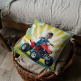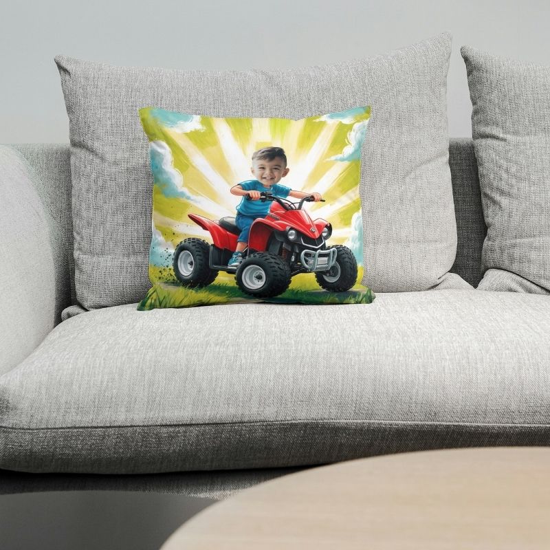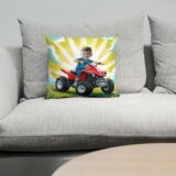 Poduszka o wymiarach 45×45 cm wykonana jest z miękkiej mikrofibry, co sprawia, że jest miła i przyjemna w dotyku. Na poduszce znajduje się jednostronny nadruk przedstawiający postać na quadzie, która może mieć twarz Twojego dziecka! Wystarczy, że wgrasz zdjęcie przed dodaniem produktu do koszyka, a my zajmiemy się resztą.